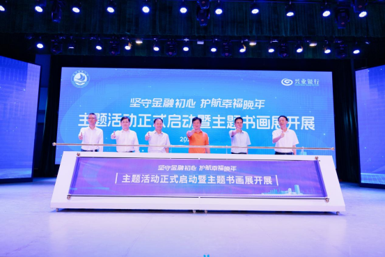 随后,各位领导嘉宾上台,共同启动2023年“金融消费者权益保护教育宣传月——坚守金融初心 护航幸福晚年”主题活动暨主题书画展。