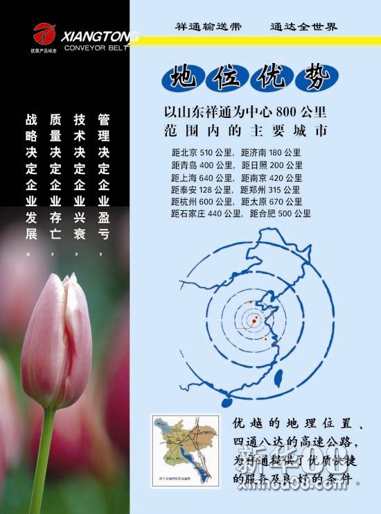先进的生产设备、专业化的管理团队、一流的工艺、一流的技术使山东祥通橡塑集团公司已成为国内同行业中具有较强竞争能力的企业,被行业和新老客户喻为中国橡胶输送带行业的一匹“黑马”。全体祥通人有决心、有信心、有能力,以一流的技术、一流的品质、一流的服务、一流的信誉、全力打造“祥通”、“鲁宝”优质品牌输送带。