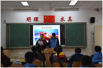 活动首先以三十九中初一五班的学生自发策划、准备并开展的“以诚信为荣、以失信为耻”的主题班会拉开序幕。在班会课中,主持人与大家分享了丰富而又生动的案例,如“曾子杀猪”等。在讲述完故事背景之后,主持人还进行了全面而又深刻的分析,现场全班同学参与热情极为踊跃,纷纷发表了自己的心得体会。最后,在主持人的带头下,部分同学也与大家分享了自己不讲诚信的小故事,将班会的主题真正带入到了学生的身边,深入到了学生的心里,进一步深化了班会课的教育效果。