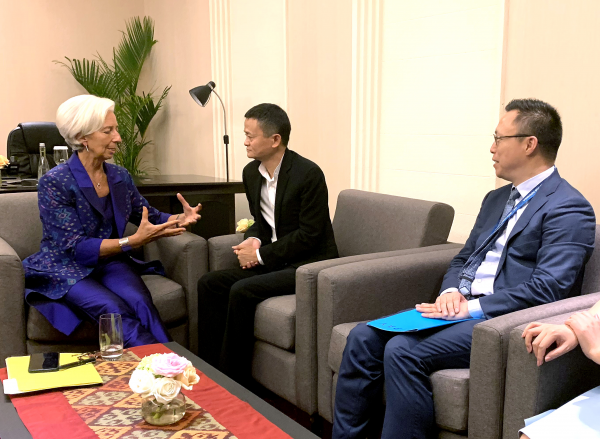 拉加德和出席世行年会的阿里巴巴董事局主席马云,蚂蚁金服董事长兼CEO井贤栋座谈