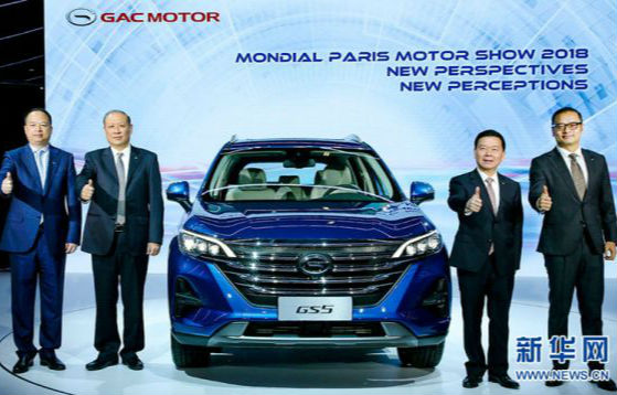 广汽集团董事长曾庆洪(右2)、广汽集团副总经理张青松(左2)、广汽乘用车总经理郁俊(左1)与广汽研究院副院长张帆(右1)在巴黎国际车展上与全新传祺GS5合影。新华网发 广汽集团供图