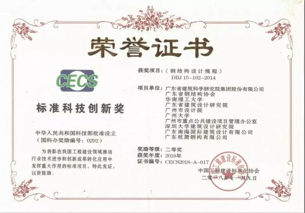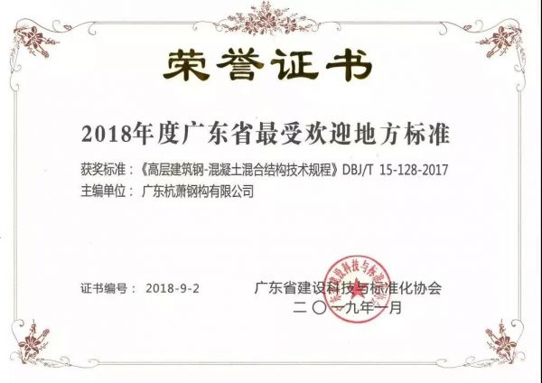 作为当地产值十强的实体企业,广东杭萧成绩显著。在政府大力支持下,早期获评国家级“高新技术企业”称号,为技术研发、工艺创新、人才引进打下了良好基础。2018年,广东杭萧获评“国家标准科技创新奖”二等奖一项,“广东省科技进步奖”二等奖一项,主编的《高层建筑钢-混凝土混合结构技术规程》DBJ/T 15-128-2017被评为“2018年度广东省最受欢迎地方标准”奖一项,取得实用新型专利10项。