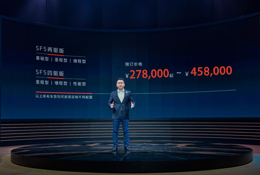 纯电车型搭载金康SERES自主研发的双电机-智能四驱系统,新车最大功率为510kW,最大扭矩为1040N·m,百公里加速最快小于3.5秒,依靠高能量密度电池,SF5纯电车型的综合续航里程超过500km。