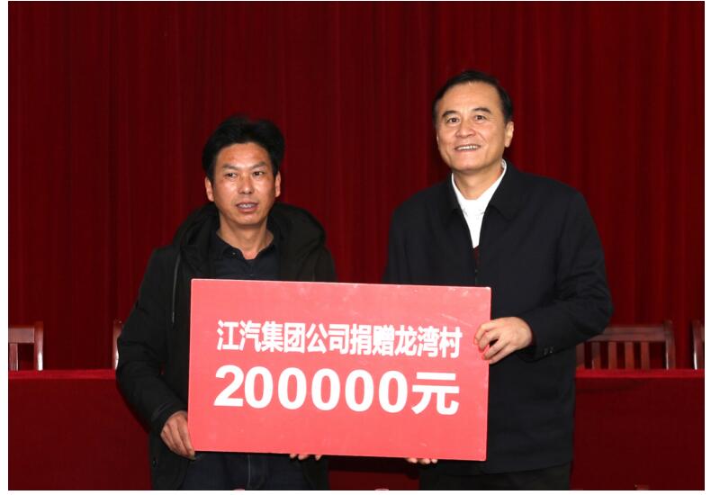 江淮汽车始终坚持抓党建促脱贫攻坚的方针,强化责任担当,履行社会责任,自2014年来,江淮汽车先后对潜山县龙湾村等结对帮扶点开展精准帮扶工作,驻村扶贫工作队履职尽责,积极谋划龙湾村发展思路,推进基础设施和发展村集体经济等项目建设,以高质量、严要求按时完成村文化广场游客服务中心农家乐项目、龙湾村招待所项目、村支路路灯安装、村卫生室改造和医疗设施增添及村民图书阅览、文化活动室建设等五个项目村基础设施建设。同时,充分发挥企业优势,在就学、就业、就学等方面给予最大力度支持。