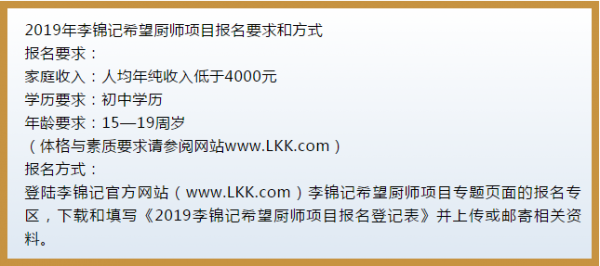 如今,2019李锦记希望厨师招募正式启动。全国范围内,凡是符合条件的优秀初中毕业生,均可咨询报名。