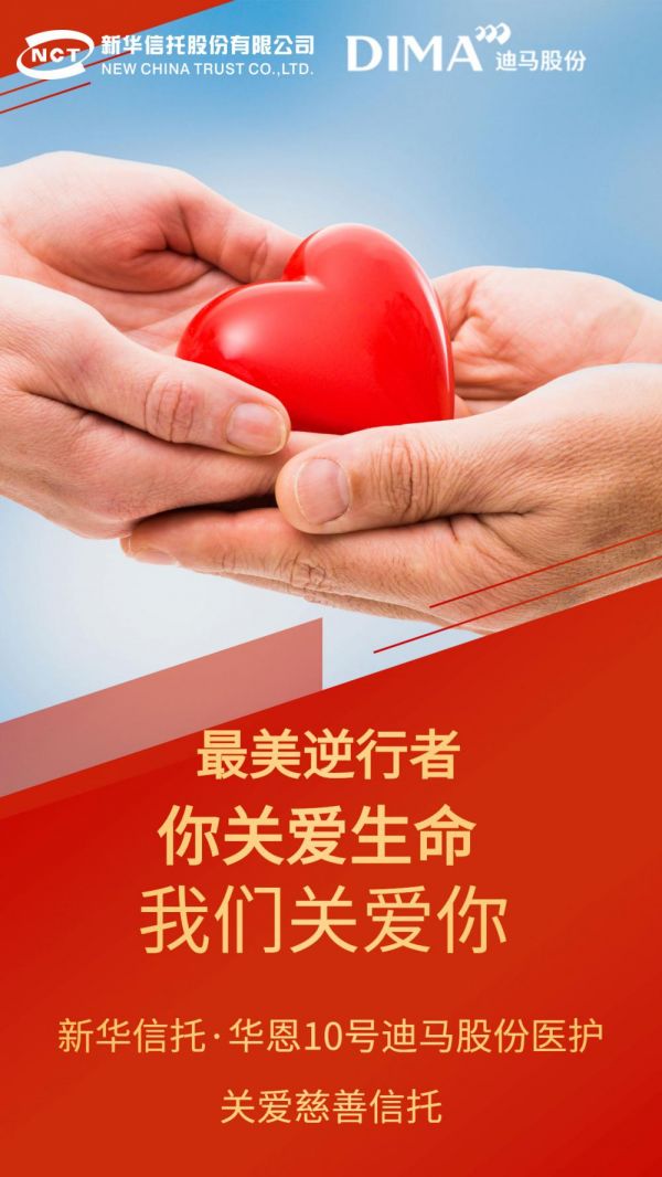 “华恩10号慈善信托”委托人为重庆市首家上市民营企业——重庆市迪马实业股份有限公司。自疫情发生以来,白衣天使们冒着生命危险和高工作强度奋斗在第一线,他们是最美“逆行者”,也是人民生命健康的守护者。1月28日晚间,迪马股份宣布捐资1000万元,成立专项慈善信托,用于对新型冠状病毒肺炎及其他未来公共卫生事件一线医护人员专项帮扶,并由新华信托作为受托人进行执行。