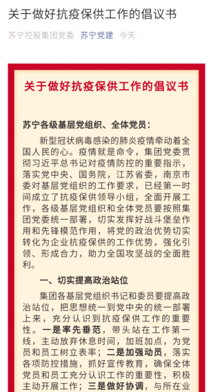 (图:苏宁党建公众号发布集团党委倡议书,要求党组织和党员行动起来,做好抗疫保供工作)