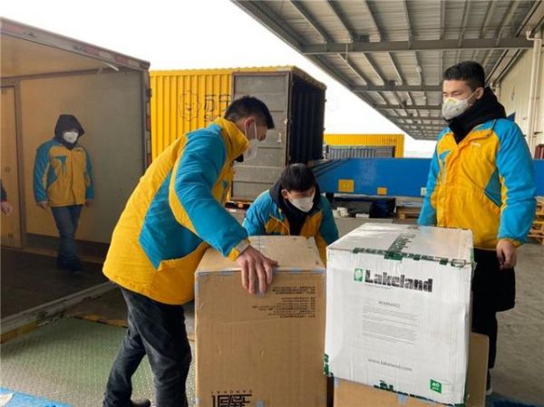 (图:苏宁捐赠的防疫物资正在装车,前往疫情中心武汉)