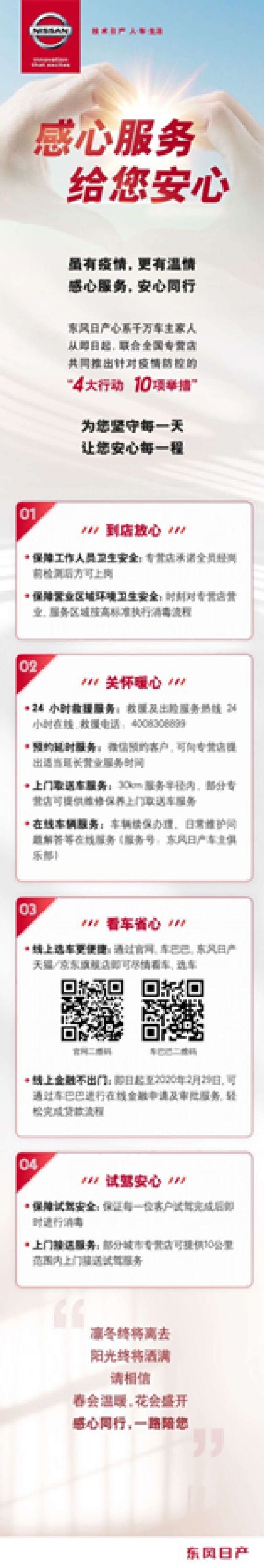 东风日产联合全国专营店共同推出针对疫情防控的“4大行动10项举措”,确保客户到店放心、关怀暖心、看车省心、试驾安心。