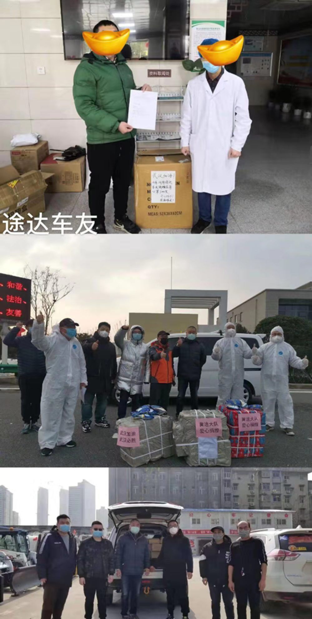 疫情期间,全国各地途达车友自发组成物资运输生命线。山东、河南、浙江、河北途达车友向武汉捐赠医疗和生活物资,武汉途达车友接送,分别送往市内医院、环卫、民警手上。
