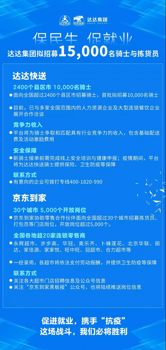 达达集团旗下达达快送平台将面向全国超过2400个县区市招募骑士,首批拟招募10000个骑士;达达集团旗下京东到家平台将协助零售合作伙伴面向全国超过30个城市招募拣货员、打包员等门店岗位,开放岗位超过5000个。目前,达达快送平台已与多家全国范围内的人力资源企业及大型连锁餐饮企业展开合作洽谈;由京东到家平台协助招募的企业已有永辉超市、步步高、华冠、奥乐齐、卜蜂莲花、北京华联、丽达、家佳源、家家悦、旺中旺、冠超市、合力超市等。