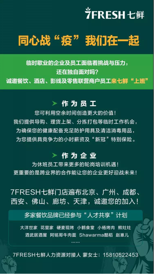 京东7FRESH也已于2月5日发布了“人才共享”计划,面向全国招募临时员工,诚邀临时歇业的员工在此期间以短期打工的方式加盟,提供收银、理货、拣货打包、客服等多种岗位选择。目前,大洋世家、花里家、小鹤食堂等多家餐饮企业员工已开始到京东七鲜超市上班,同时收到多家企业热线咨询表示愿意加入。