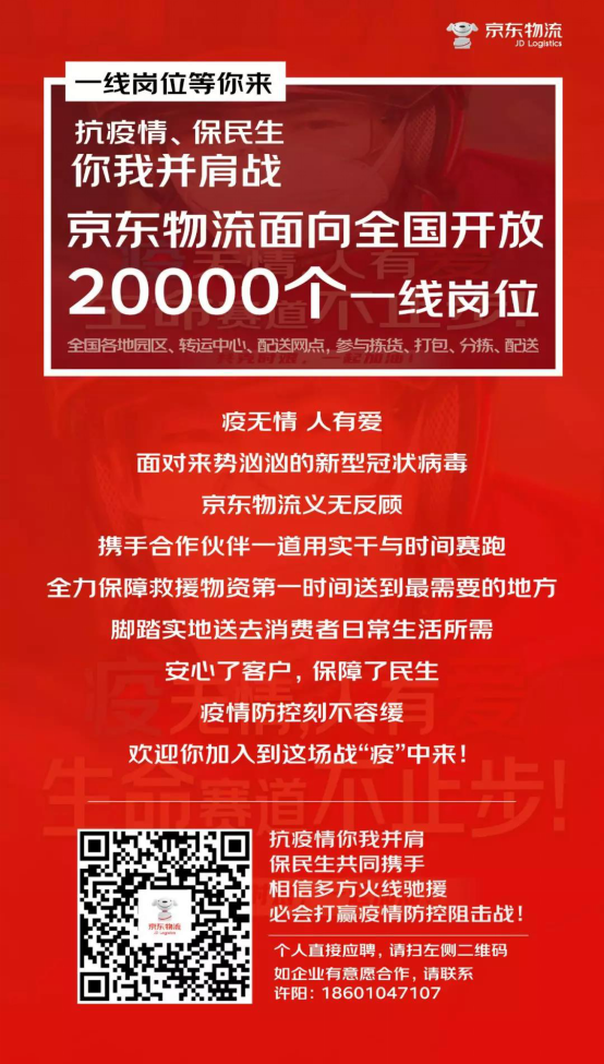 目前,京东物流将面向全国开放包括仓储员、分拣员、快递员、驾驶员等在内的超过20000个一线岗位。同时,已有十余家企业与京东物流开展了多种形式的异业合作,输送了700余名员工在京东物流各园区、转运中心、营业部等参与拣货、打包、分拣、配送等工作。