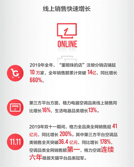 在开拓新渠道的同时,格力继续加强与京东、天猫、苏宁等第三方平台的合作,坚持走“品质电商”的发展路线,凭借过硬的品质和良好的口碑获得多平台用户青睐。据统计。2019年格力电器空调品类线上销售同比增长16%,生活电器品类增长13%。仅双11期间,格力全品类全网销售就突破41亿元,同比增长200%。线上线下的深度融合为格力未来的发展带来了新的突破口,也势必给行业格局带来深刻影响。