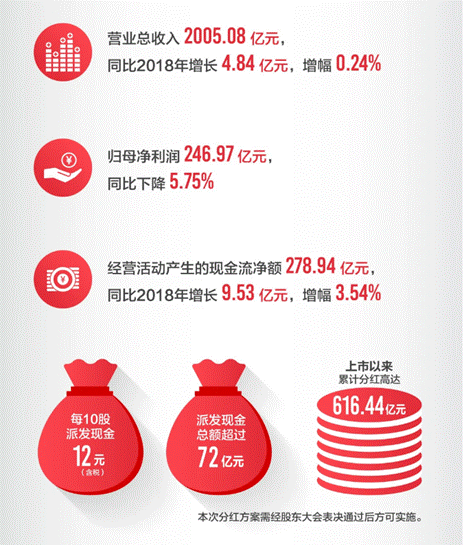 4月29日晚,格力电器发布《2019年年度报告》。报告显示,2019年全年公司实现营业总收入2005.08亿元,同比增长0.24%;实现归母净利润246.97亿元,同比下降5.75%;经营活动产生的现金流量净额278.94亿,同比增长3.54%。报告公布了2019年度利润分配预案,计划向全体股东每10股派发现金12元(含税),继续保持了格力一贯的“高分红”模式。