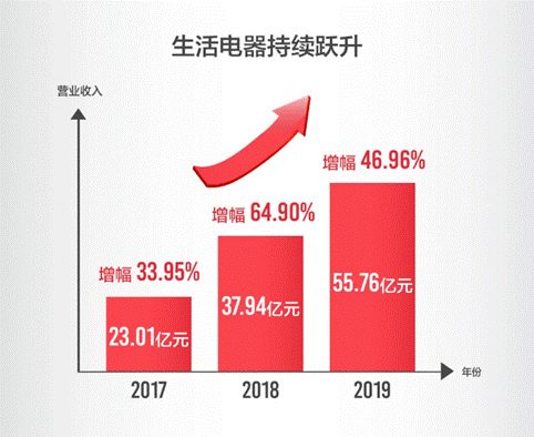 在格力电器《2019年年度报告》中,空调和生活电器的占比变化同样引人瞩目,前者从2018年的78.58%降至69.98%,后者则从1.91%增长到了2.81%。换言之,格力生活电器发展迅速,2019年实现了46.96%的增长。而参考格力电器近三年的年度报表可见,生活电器在2017年增长33.95%,2018年增长64.9%,2019年增长46.96%,近三年来连续高增长,平均连续增幅接近50%。