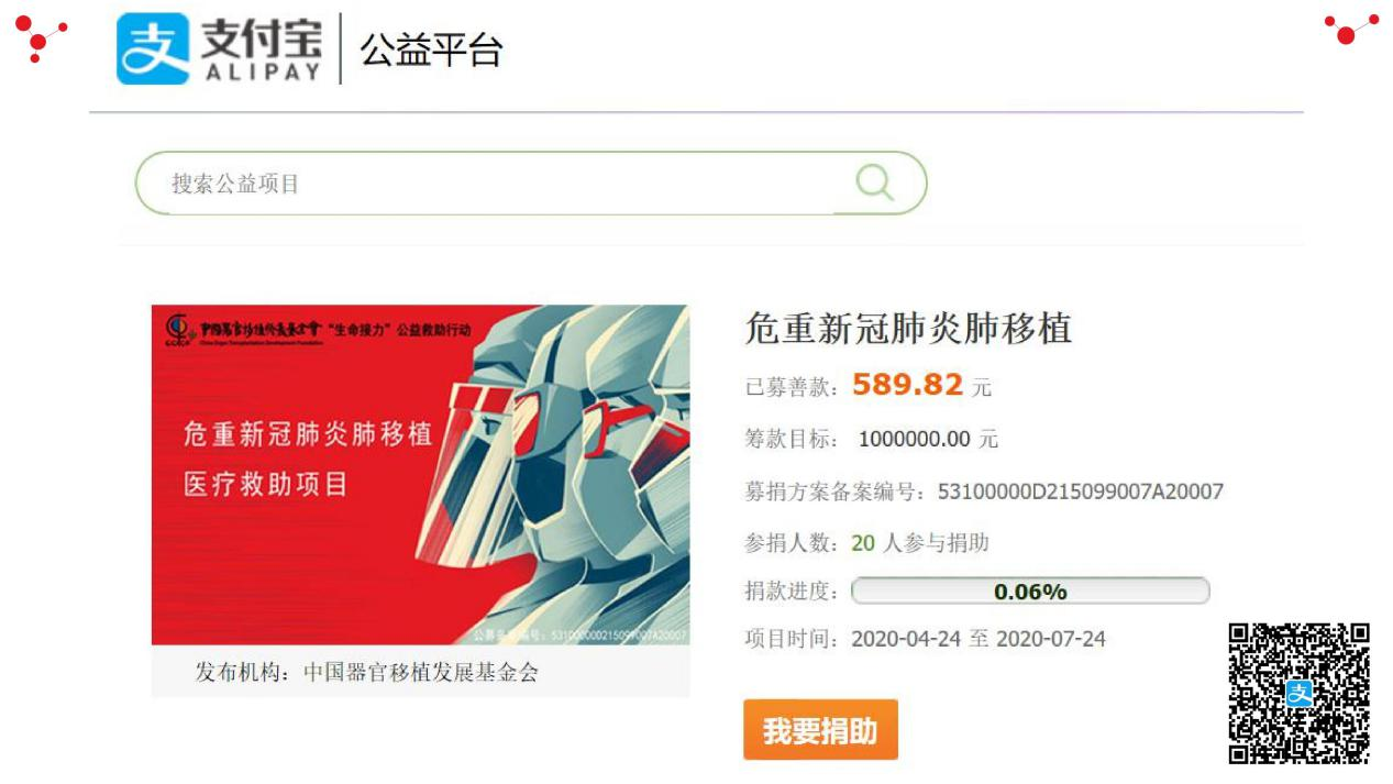 中国器官移植发展基金会发起“‘生命接力’公益救助行动—高选择性、高防护性危重症新冠肺炎肺移植医疗救助项目”,组织全国顶尖肺移植专家及团队,在高选择性、高防护性的前提下,开展医疗救助。