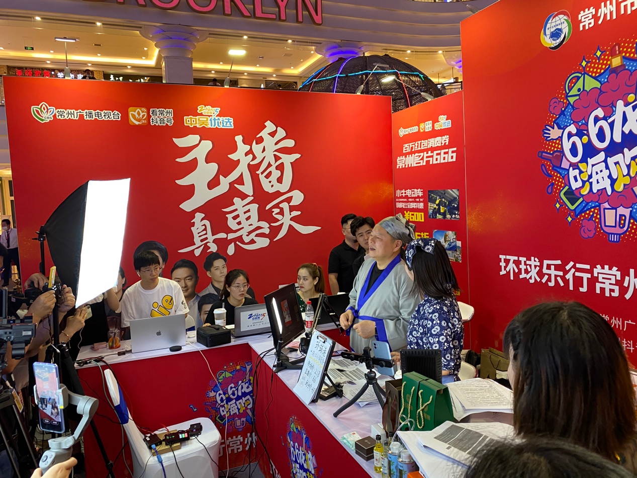 真正引发高潮,是常州广播电视台在江南环球港内搭建的“线上直播间”,丁佐宏换上“店小二服装”,开启了当天的“带货达人”模式。