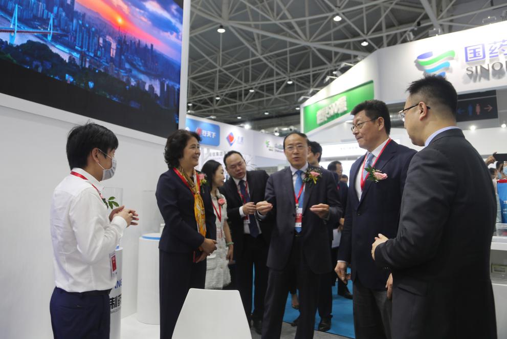 青岛市委常委、市委宣传部部长孙立杰,国药集团党委副书记、国药励展董事长杨柳一行参观尔康制药展位