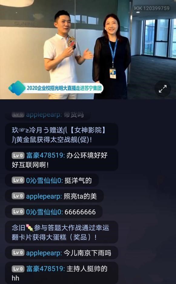 近日,“2020企业校招光明大直播”走进苏宁。光明日报、光明网与苏宁总部远程连线,苏宁相关工作人员通过直播的形式带领应届生“云游”苏宁,参观包括苏宁园区、工作环境、苏宁大学、无人店,以及餐厅、健身房等硬件设施。同时,苏宁工作人员还向毕业生们介绍了定期组织的苏宁之夏、家庭日、运动会和善行者等文娱活动。