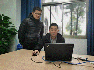 陈军与员工开展技术讨论(右)