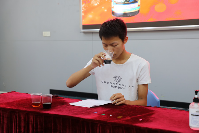 图为李锦记希望厨师粤菜师傅班面试现场,考生郭博扬正在进行嗅觉测试。
