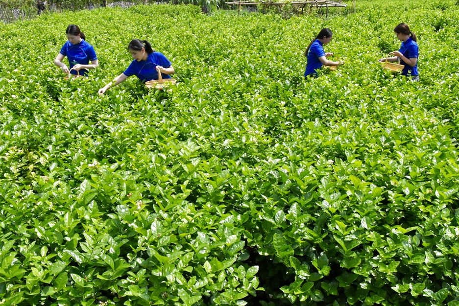 笔者在现场看到,春光村千亩农田种植绿白相映的茉莉花,一阵清风掠过,整个村里都能闻到淡淡的茉莉花香,令人心旷神怡。正值晌午,村民们纷纷戴起草帽,背着竹娄,前往自家的种植田采摘茉莉花。为何正午采花?是因为这一时段茉莉花的花蕾可达到理想的成熟度,花蕾中的芳香物质含量是最高的。