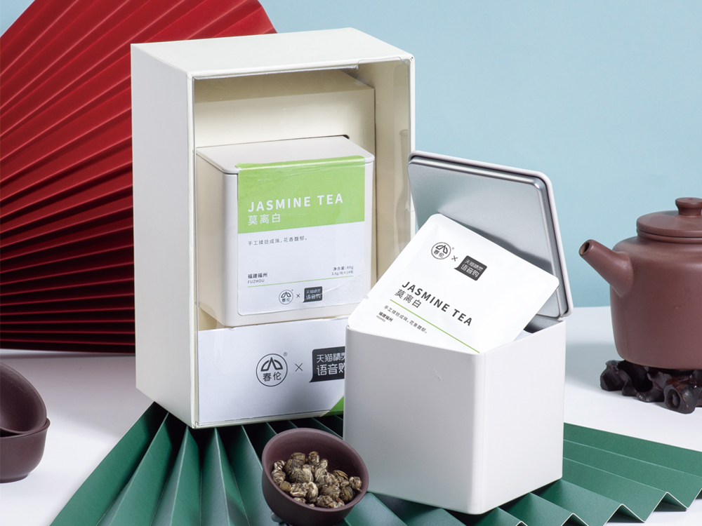 尽管茶叶本身的消费场景十分丰富,但让年轻人爱上茶却并非一件容易的事情。抓住年轻消费者的心,也是整个茶行业近几年重点攻破的难题。除了创新营销话题的打造,考虑到年轻消费群体对于颜值、个性化方面的要求,春伦集团同天猫共同设计打造出首款茉莉花茶独立小包装产品——“莫离白”礼盒。“莫离”取自“愿得一心人,白首莫相离”,同时也音同茉莉。