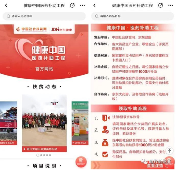 今年5月,京东健康和中国社会扶贫网合作推出的药品补助工程,目前这项工程是国内覆盖范围最广、补助资金最多、惠及范围最大的健康扶贫项目之一。