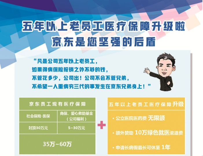 随后,京东宣布司龄满五年的京东正式员工医疗保障升级,当京东员工罹患威胁生命安危的疾病时,包括通常大家熟知的重大疾病,并额外扩展了非重大疾病但至重症监护治疗的情况,京东员工在使用现有社保,公司商保,公司爱心救助基金总计约35~60万的医疗保障基础上,超出的医疗费用京东都将“无限额”报销。除此之外,京东还额外提供10万元绿色就医渠道费用,让员工可以快速就医并获得更好的医疗医师救治资源。