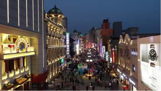 在开街启幕仪式前夕,通过无人机航拍的街景画面,中街商会会长李斌为主持人和直播间的观众们,介绍此次中街改造的亮点。这次中街改造的一个宗旨是“恢复建筑历史风貌”。中街鳞次栉比的老建筑是沈阳商业的历史见证,具有深厚的历史文化底蕴。此次对于中街的改造,坚持“以商兴街、以古为新”的理念,将清代、民国与现代风貌相结合,从整体、局部和细节三个方面,运用现代建筑与构造手法,使中街面貌焕然一新,凸显中街建筑之美。