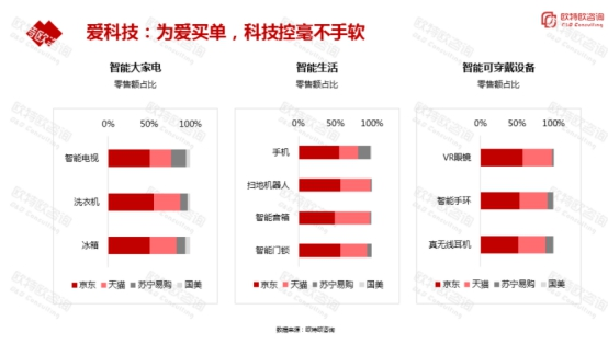 不仅是总体占比,在各细分领域,京东的“京品”家电及其它C2M(反向定制)战略产品在此次11.11继续以“几何级”增长,在扫地机器人、音箱、耳机、手环、门锁等多个智能产品领域均保持大幅领先;满足消费者各种“微需求”的同时,也给行业和品牌厂商带来新的增长点。