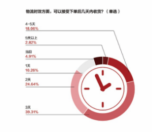 据《南方都市报》在此11.11期间作的一项用户满意度调研显示,79.1%的受访者可接受的收货时间为3天以内,只有2.82%的受访者认可5天以上。这意味着,97.18%的消费者不能接受送货时间超过5天。