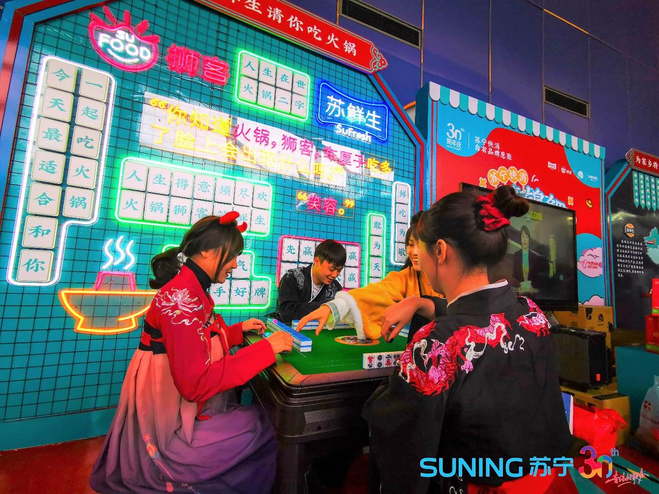 司庆当天,苏宁总部各处都“红红火火”,多年延续的“红装入园”传统,仪式感拉满,一路能收获各种礼物。12月生日的员工集体过生日,特色生日面、精美大蛋糕一早就开启苏宁人的味蕾;各种富有年代感的老物件像放电影般回放着1990-2020三十年的发展历程;各大网红和赛博朋克风的游戏赚足眼球。