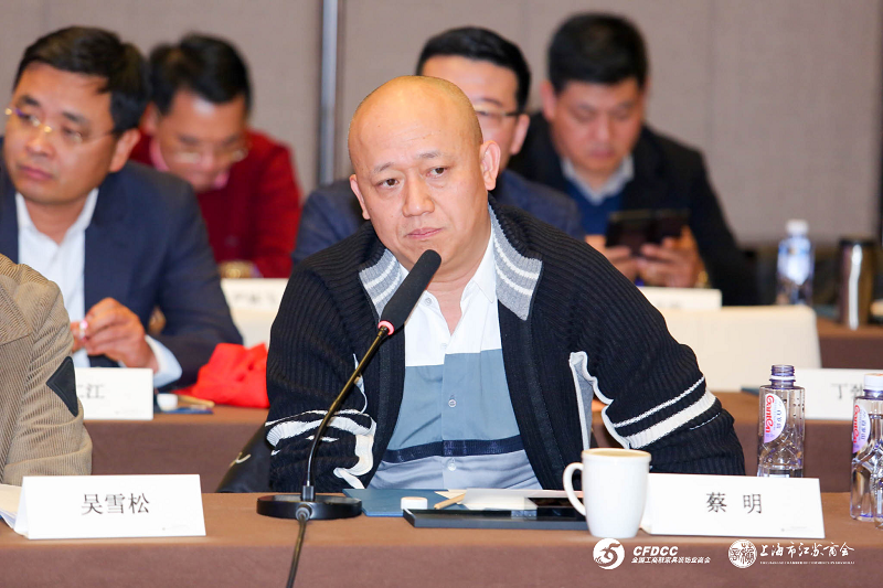 全国工商联家具装饰业商会执行会长、博洛尼智能科技(青岛)有限公司董事长蔡明在座谈会上发言