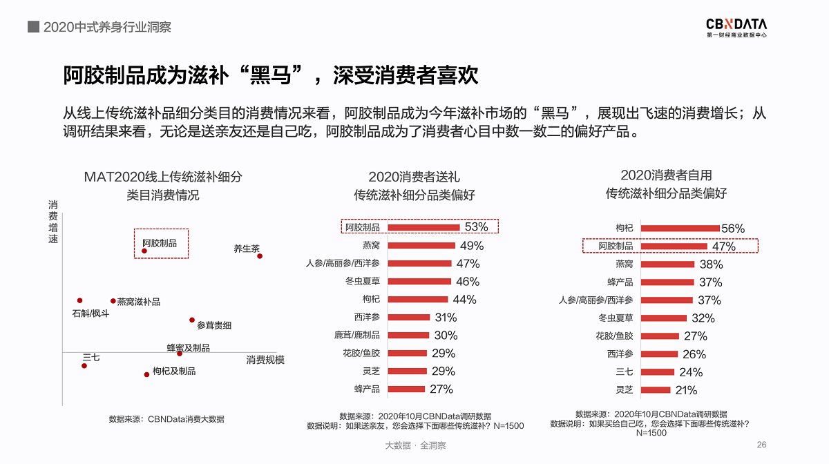 众多传统滋补品需求势头向好,哪类会从中“脱颖而出”呢?报告显示,从线上传统滋补品细分类目的消费情况来看,阿胶制品成为今年滋补市场的“黑马”,展现出飞速增长趋势,在2020消费者送礼传统滋补细分品类偏好排行中超越燕窝、人参等,排名首位。无论是送亲友还是自用,阿胶制品成为了消费者心目中数一数二的偏好产品。超过六成的“阿胶爱好者”表示,购买传统滋补品时更喜欢历史悠久的老字号品牌。这些数据都为传统老字号滋补品牌东阿阿胶在年轻消费群体中的发展提供机遇。