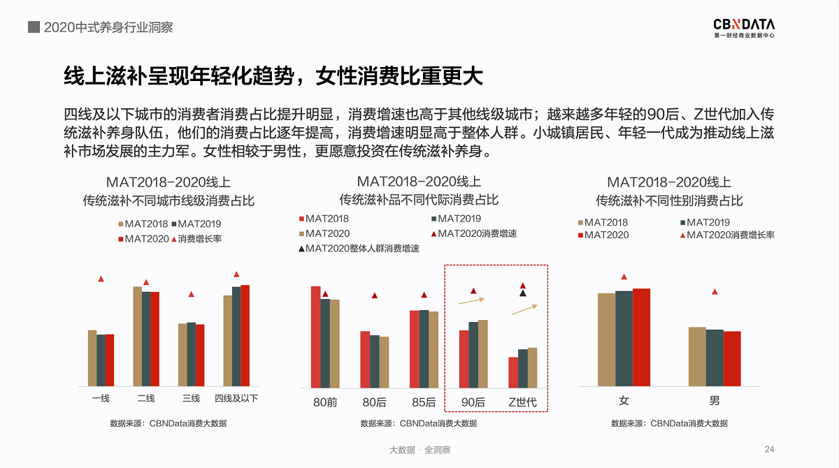 近日,第一财经商业数据中心发布《2020中式养身行业洞察报告》(以下简称报告)。报告显示,近六成受访者表示新冠疫情发生后对中医药的关注度、信任度明显提高。中医药在抗击疫情中一度“走红”,使得中式养身逐渐成为国民应对健康问题的热门对策,带动了传统滋补养身的需求逐渐上涨。线上滋补呈现年轻化趋势,越来越多年轻的90后、Z世代加入传统滋补养身队伍,他们的消费占比逐年提高,消费增速明显高于整体人群。