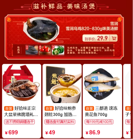 在苏宁线下,也能采购年夜饭。家乐福推出超200款半成品、熟食,半成品包括老字号名菜礼盒、熟食礼盒腿等,熟食以烤鸡、酱鸭、八宝饭等为主,更有福建佛跳墙、广东盆菜、川味腊肉腊肠等颇具地方特色的经典年菜,让异乡人吃到家乡味道。