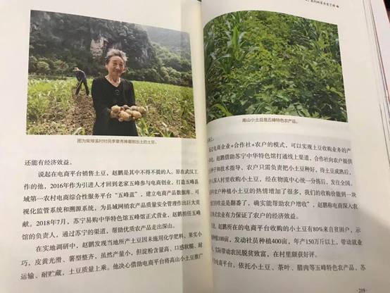 在《触摸幸福:走向我们的小康生活》一书中,首先看到的是“小土豆走出高山”这一苏宁经典扶贫案例。湖北省九个深度贫困县之一五峰自治县,当地盛产高山特色小土豆,却因地处偏僻无人问津。通过电商企业+合作社+农户的模式,苏宁帮助当地实现土豆收购业务的产销一体化,助力小土豆成功走出大山。生产过程中,合作社向农户提供老土豆种子和技术指导,农户负责把小土豆种好,待土豆成熟后,安排专人深入村里收购小土豆,经在物流中心统一分拣后,发往全国。销售过程中,依托苏宁平台的中华特色馆、苏宁拼购等线上页面的重点曝光和特色促销,小土豆销售打通线上渠道,实现广泛关注。