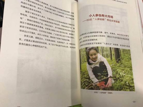 书中还收录了吉林省白山市涂松县万良镇“人参姑娘”回乡创业带动乡村致富的动人故事。“人参之乡”万良镇,有全国乃至亚洲最大的人参交易集散地。在外打工感受电商蓬勃发展的马晓彤想到家乡人参还是传统的销售模式,决定回乡创业开展电商平台售卖人参。经过多方考察和了解,马晓彤选择加入苏宁电商平台,开通抚松扶贫馆和苏宁拼购店铺。同时,苏宁也给予了马晓彤很大的技术支持和流量支持,现在无论是单量还是销售额都在迅速增长,由于单量的提升,在降低快递成本的同时,利润也增加了不少,还帮助了更多的农户打开了销售通路。