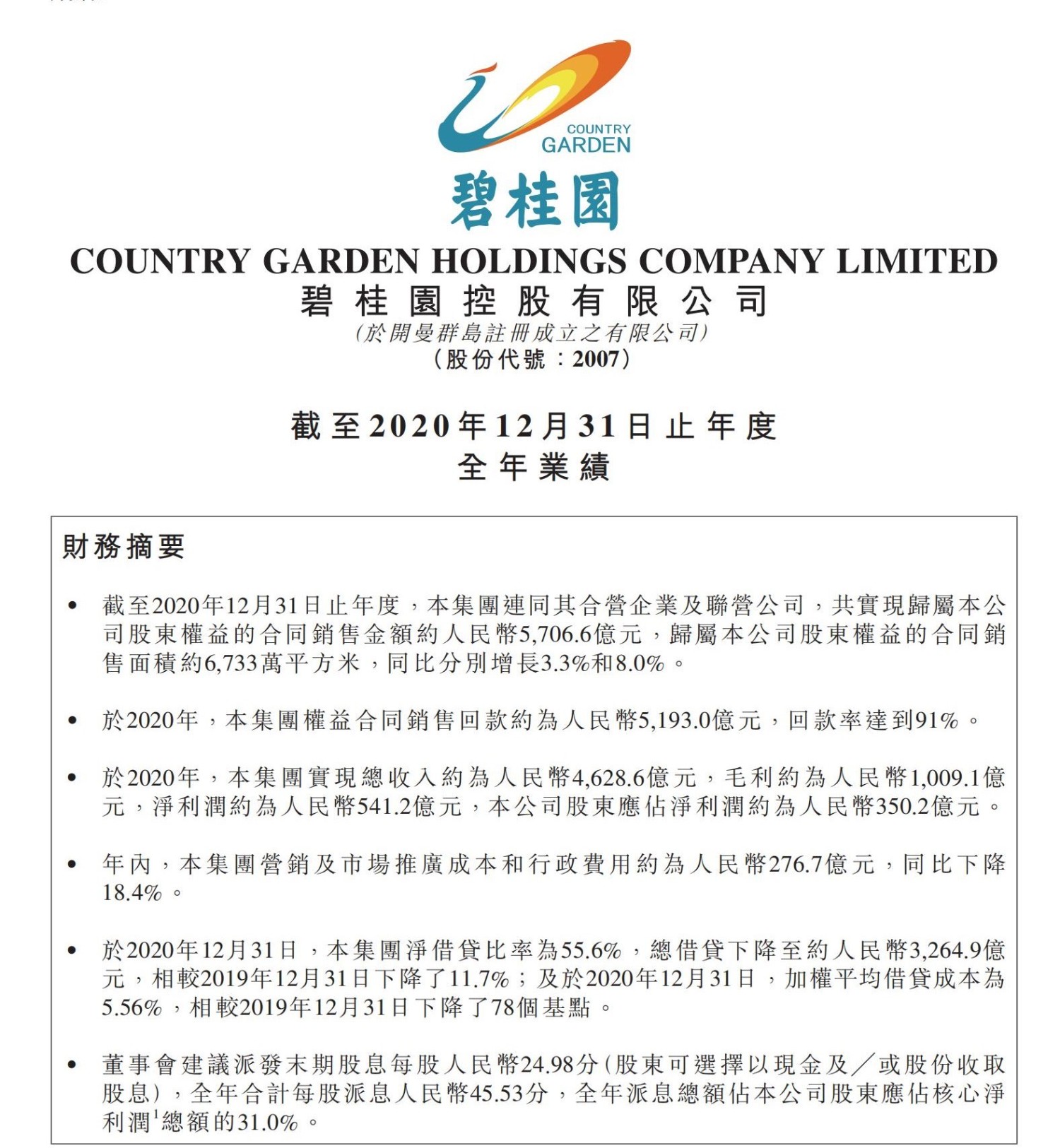 截至2020年12月31日,公司有息负债总额从3696亿元下降至3265亿元,相较2019年底下降了11.7%。期末,碧桂园净借贷比率为55.6%,已连续多年低于70%,公司杠杆持续处于行业低位。