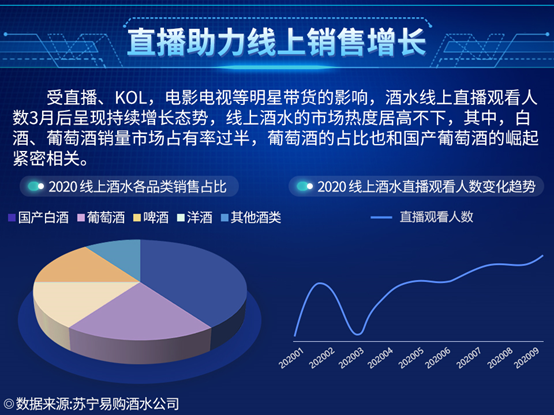 受直播、kol,电影电视等明星带货影响,酒水线上直播观看人数3月后呈现持续增长态势,线上酒水的市场热度居高不下。其中,白酒、葡萄酒销量市场占有率过半,葡萄酒的占比也和国产葡萄酒的崛起紧密相关。
