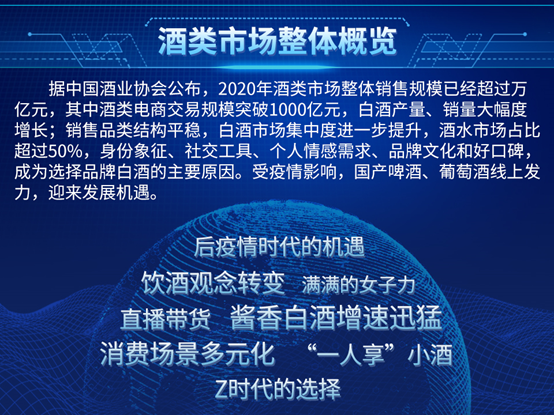 据中国酒业协会公布数据显示,2020年酒类市场整体销售规模已经超过万亿元,白酒产量、销量大幅度增长,其中酒类电商交易规模突破1000亿元,白酒产量、销量大幅增长;销售品类结构平稳,白酒市场集中度进一步提升,酒水市场占比超过50%,身份象征、社交工具、个人情感需求、品牌文化和好口碑,成为选择品牌白酒的主要原因。受疫情影响,国产啤酒、葡萄酒线上发力,迎来发展机遇。