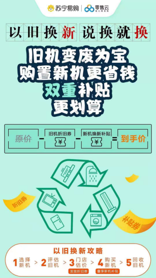 与县镇市场以往随意性、粗放式的收旧方式不同,零售云推出的“以旧换新”将迈入常态化、正规化的轨道,为消费者提供更加高效、专业、透明的回收服务。以消费者身边的苏宁易购零售云门店为中心,门店覆盖半径内,一站式的换新收旧服务将让消费者获得全时、全域的体验。