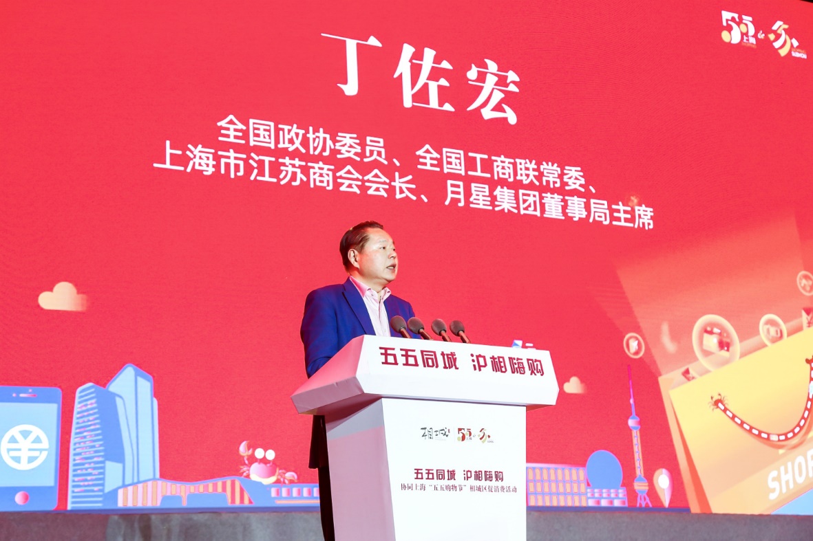 5月1日晚,全国政协委员、全国工商联常委、月星集团董事局主席、首席店小二丁佐宏作为企业家代表参加“2021年全国消费促进月暨上海五五购物节”启动仪式