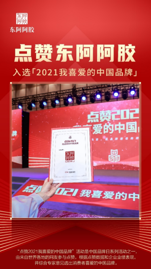 据悉,在今年的中国品牌日系列活动中,东阿阿胶凭借一直以来对道地品质与优异服务的坚守,成功入选“2021我喜爱的中国品牌”。“点赞2021我喜爱的中国品牌”活动是由来自世界各地的网友参与点赞,根据点赞数据和企业业绩表现,并综合专家意见选出消费者喜爱的中国品牌。