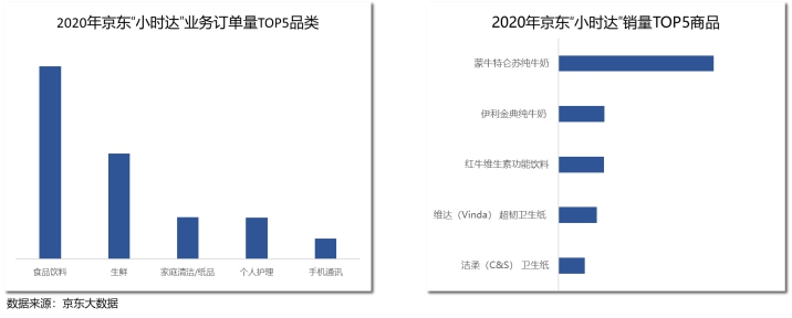 即时消费正在从以生鲜快消为核心,向全品类拓展。2020年,无论从订单量还是销量来看,食品饮料、生鲜、家庭清洁、个人护理等生鲜快消品都是即时消费的核心品类。