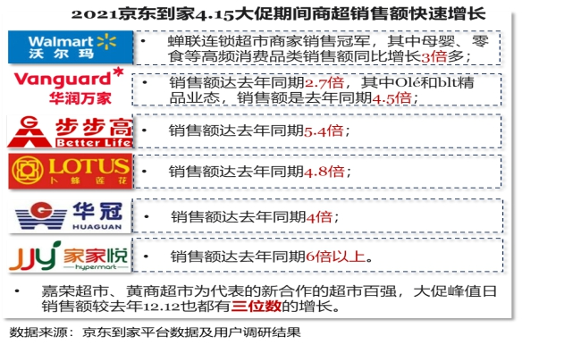 目前,京东到家与沃尔玛、永辉、华润万家等全国连锁超市达成深度合作,商超销售额实现快速增长。