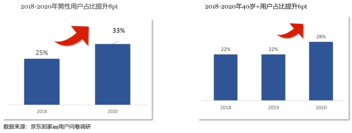 同时,即时消费用户向更多元和全面的客群拓展。2018-2020年,京东到家男性用户和40岁+用户占比显著提升,其中男性用户占比提升8%,40岁+用户占比提升6%。
