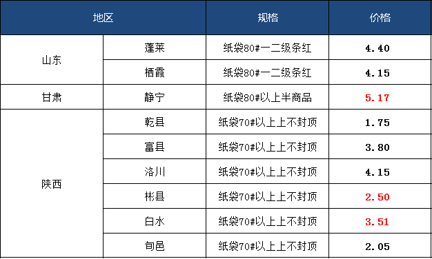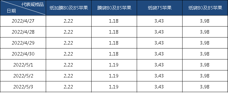 指数监测显示,截至5月3日,纸加膜80及85规格富士苹果均价为2.22元/斤,膜袋80及85规格富士苹果均价为1.19元/斤,纸袋75规格富士苹果均价为3.43元/斤,纸袋80及85规格富士苹果均价为3.98元/斤。
